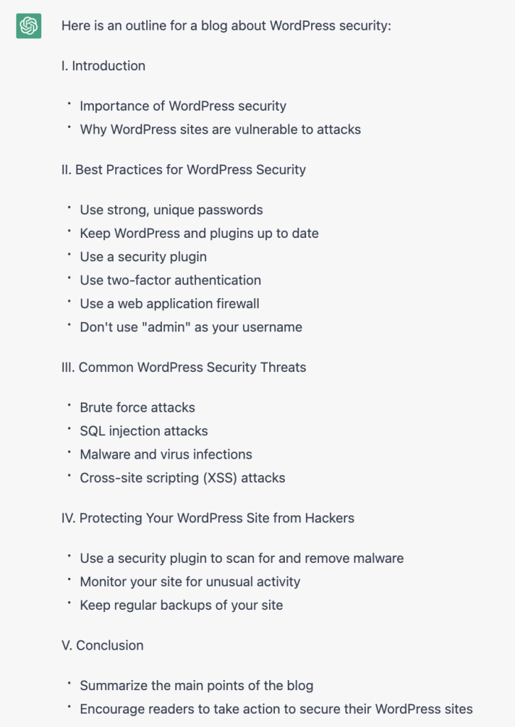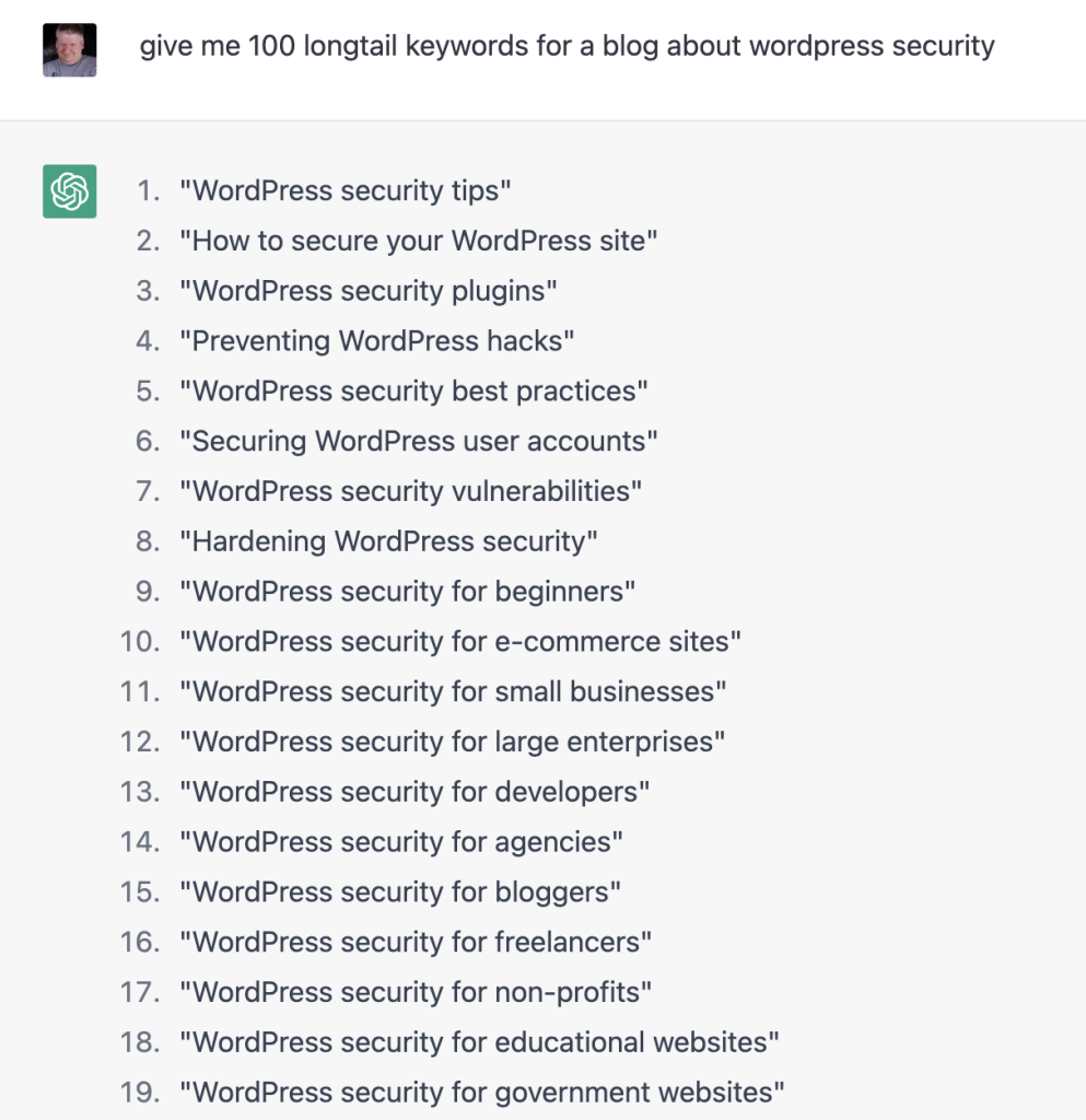 When we asked Chat GPT for a list of 100 long-tail keywords pertaining to WordPress Security, it gave us 70. I don’t see this as a problem, but be aware it will only give you what it can find.
