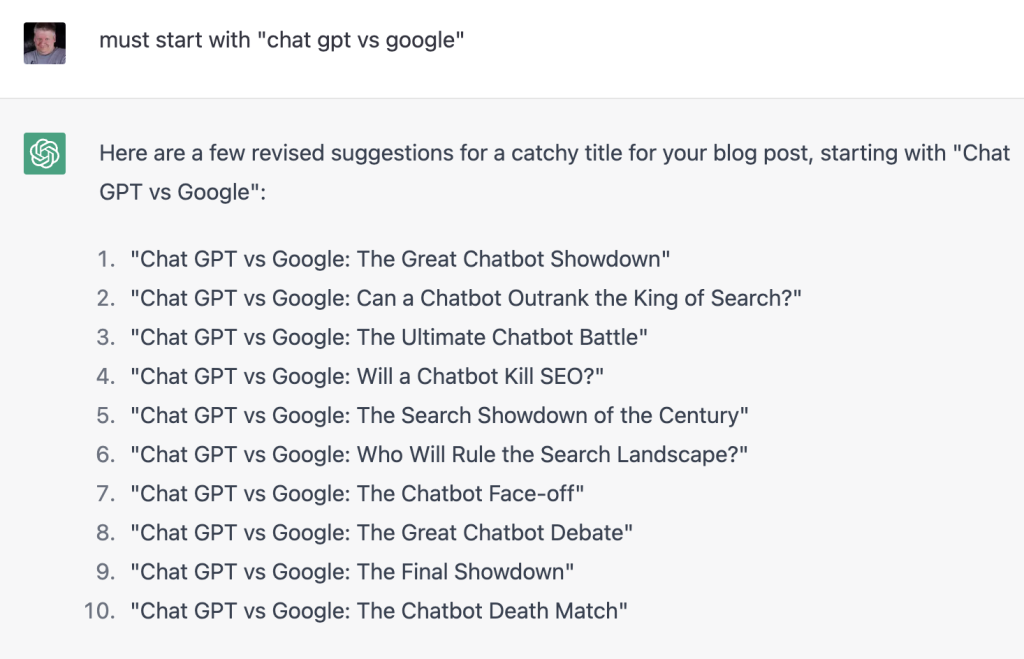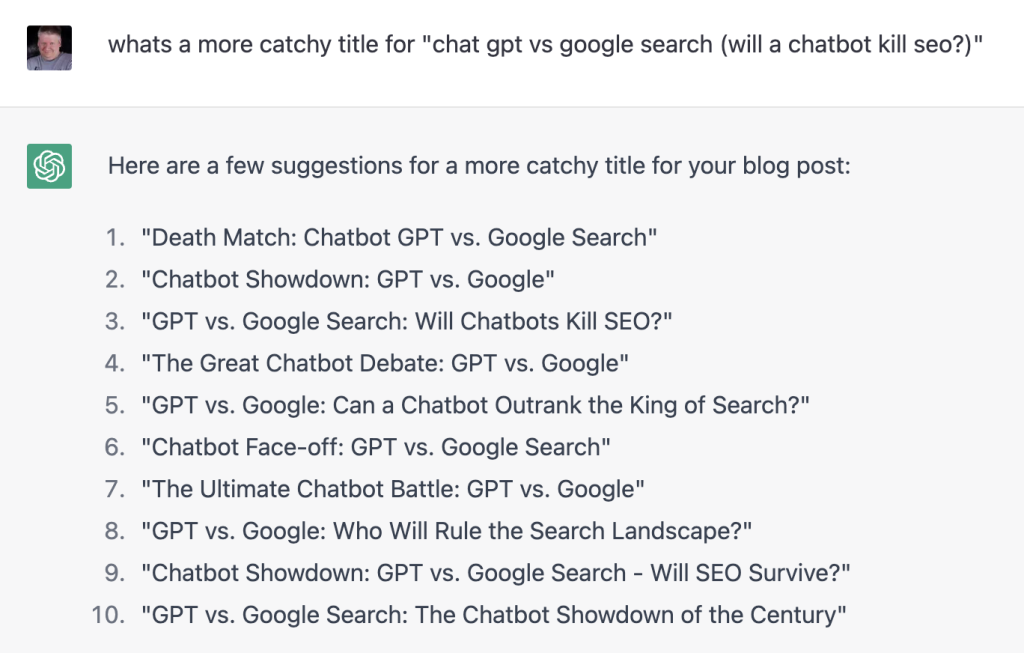 - Example, “whats a more catchy title for ‘chat gpt vs google search (will a chatbot kill seo?)'”