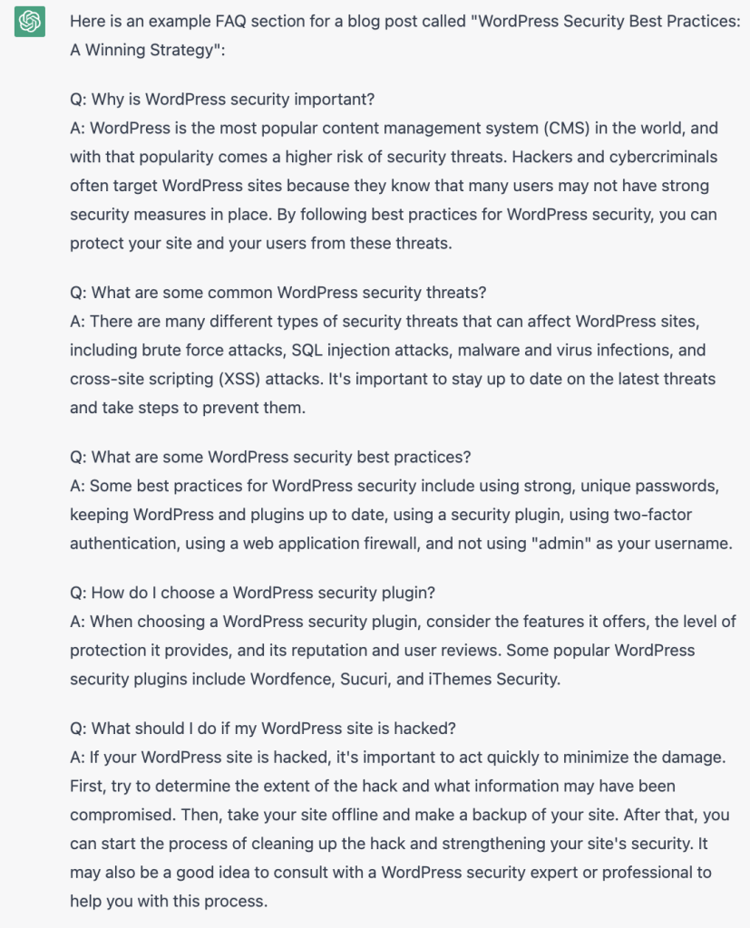- Example, “make an faq section for a blog post called ‘wordpress security best practices (A winning strategy)'”